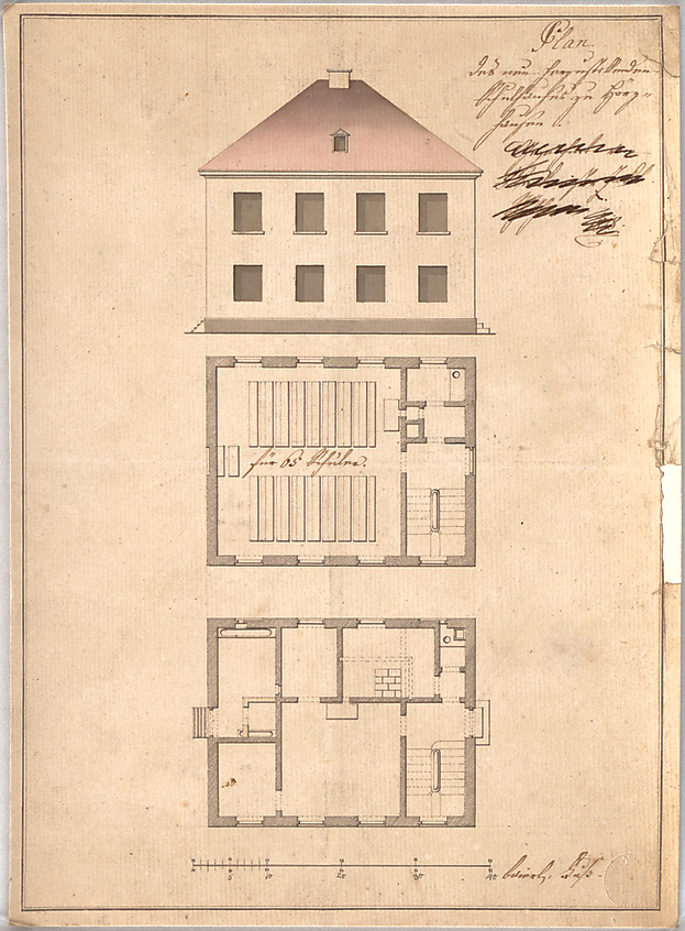„Plan des neu herzustellenden Schulhauses zu Hörzhausen“ von Johann Michael Voit (Architekturmuseum der TU München). Ob dieser Plan genauso verwirklicht wurde, bleibt unklar, denn es gibt keine Außenansichten dieses alten Schulhauses.