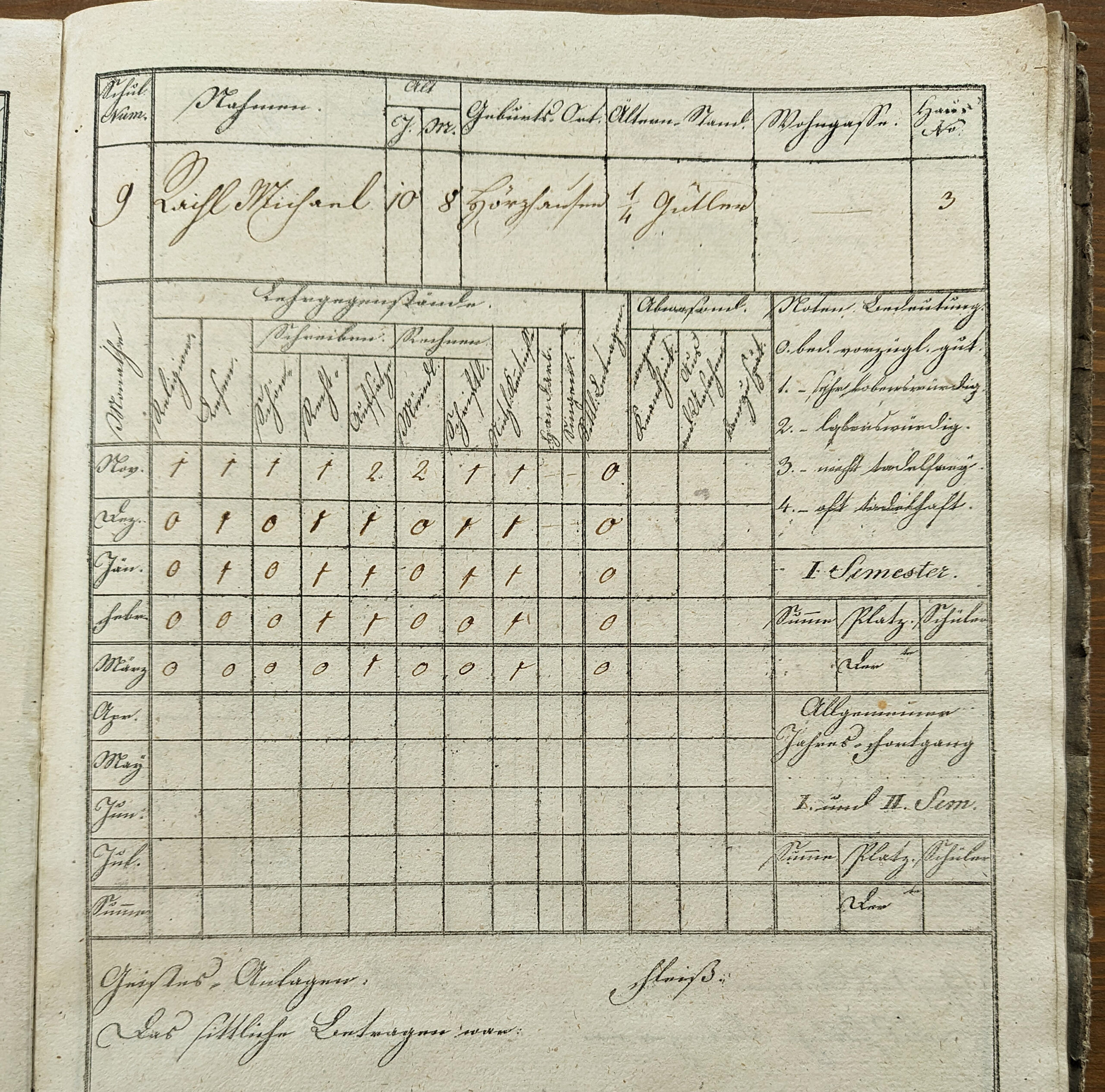 Die Leistungen der Schüler wurden benotet, die Noten in „Zensurbüchern“ festgehalten. Für Hörzhausen ist ein sehr frühes Zensurbuch aus dem Jahr 1820 erhalten. Wir zeigen hier eine Seite für den Schüler „Raichl Michael, 10 Jahre und 8 Monate alt, geboren in Hörzhausen, Sohn eines 1/4 Gütlers“.