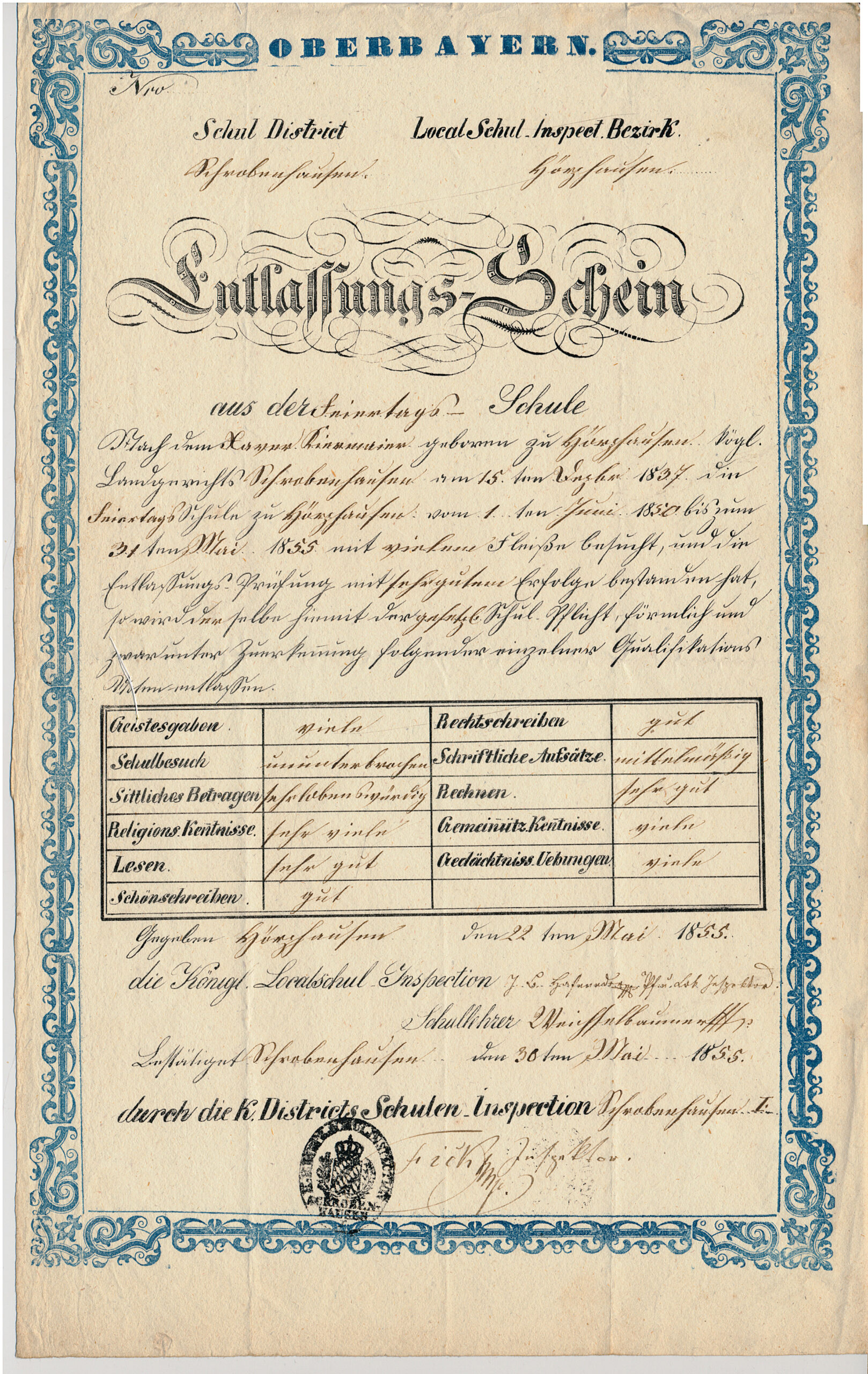 Am Ende der Schulzeit gab es wie heute Schulentlassungs-Zeugnisse. Das Stadtarchiv hat eine Sammlung alter Zeugnisse, hier ein Entlassungszeugnis aus der Hörzhausener Feiertagsschule aus dem Jahr 1855, mit dem zugleich die Schulpflicht beendet war. Entlassungs-Zeugnisse waren nicht nur Erinnerungsstücke, sondern wichtig für den weiteren Lebensweg, zum Beispiel konnte niemand heiraten, der nicht die Schulpflicht hinter sich gebracht hatte.