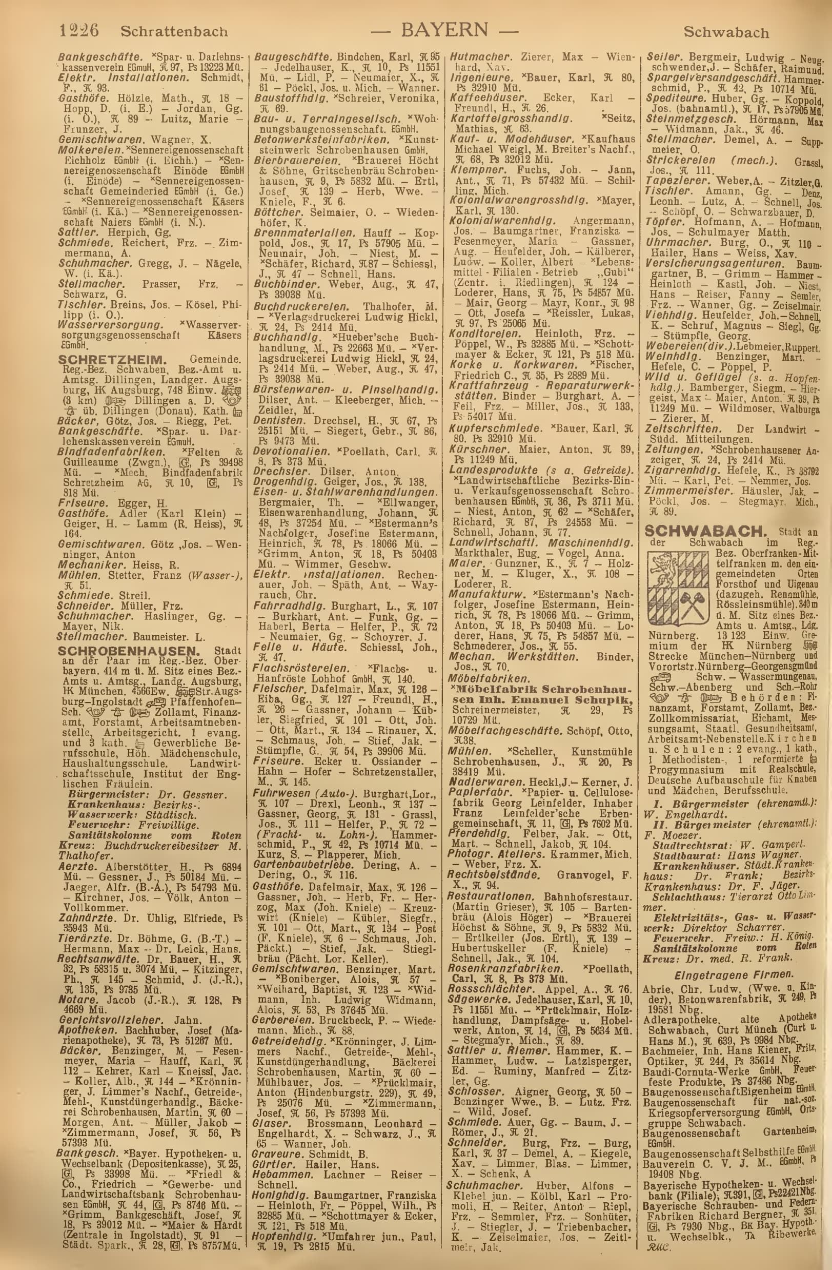 Wir veröffentlichen hier auszugsweise die Angaben, die in diesem Branchenbuch über die Stadt Schrobenhausen und die Gemeinden des Landkreises, damals noch Bezirksamt Schrobenhausen, verzeichnet sind. Es sind nicht alle Gemeinden des Altlandkreises aufgenommen. Ob dies mangels Informationen oder aus anderen Gründen geschah, lässt sich nicht nachvollziehen.